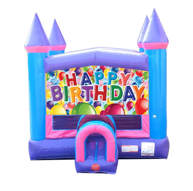 Happy BirthdayPink, Purple, & Blue Bounce House:Happy Birthday1 Introducing the ultimate party attraction: our vibrant Pink, Purple, and Blue Bounce House! Perfect for adding a splash of color and endless fun to any event, this eye-catching bounce house features a dazzling blend of pastel pink, rich purple, and serene blue. The cheerful colors create a whimsical atmosphere that delights children and makes for stunning photos.