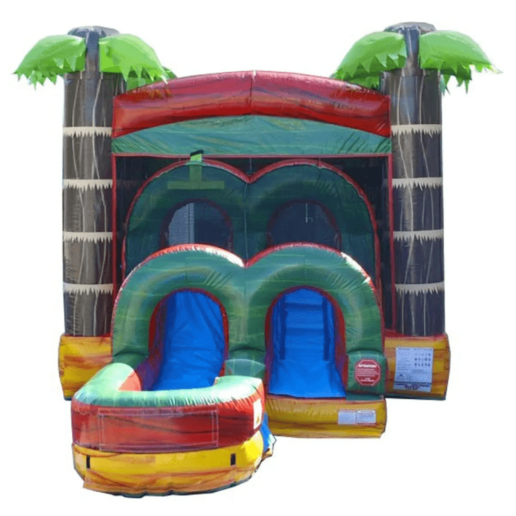Turn up the heat at your next party with our Tropical Fire Marble Water Slide & Bounce House Combo—the ultimate centerpiece for fun and excitement! With its vibrant palm tree design and fiery marble colors, this inflatable instantly transforms any event into a tropical adventure. Kids can jump, climb, and slide for hours of nonstop entertainment, whether they’re bouncing in the spacious play zone or racing down the slide into a refreshing splash pool. Want to keep things dry? No problem—this combo easily converts to a dry slide for cooler days or indoor fun. Built with commercial-grade materials, safety netting, and sturdy construction, it’s perfect for birthdays, backyard parties, school events, and more. The eye-catching design and dual play options make it a crowd favorite that keeps the laughter going all day long. Bring island vibes, epic fun, and lasting memories to your event—book the Tropical Fire Marble Combo today and make your celebration unforgettable!